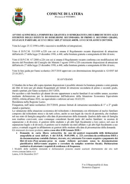 Avviso ai fini della fornitura gratuita o semigratuita dei libri di testo agli studenti degli istituti di istruzione secondaria di primo e secondo grado, statali e paritari, ai sensi dell'art. 27 legge 448/98 - Anno scolastico 2017/2018