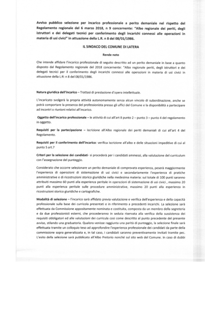 Avviso pubblico selezione per incarico professionale a perito demaniale nel rispetto del Regolamento regionale del 6 marzo 2018, n.9 concernente: "Albo regionale dei periti, degli istruttori e dei delegati tecnici per conferimento degli incarichi connessi alle operazioni in materia di usi civici" in attuazione della L.R. n.8 del 08/01/1986