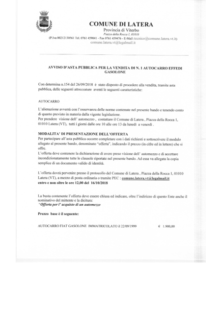 Avviso d'asta pubblica per la vendita n. 1 autocarro Effedi Gasolone
