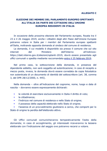 Elezione dei membri del Parlamento Europeo spettanti all'Italia da parte dei cittadini dell'Unione Europea residenti in Italia
