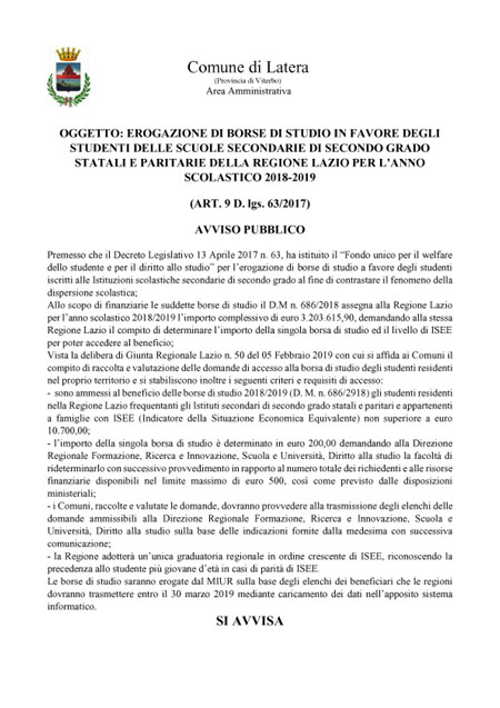 Avviso - Erogazione di borse di studio in favore degli studenti delle scuole secondarie di secondo grado statali e paritarie della Regione Lazio per l'anno scolastico 2018-2019