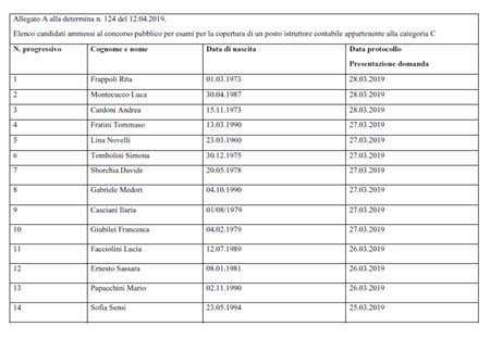 Elenco candidati ammessi al concorso pubblico per esami per la copertura di un posto istruttore contabile appartenente alla categoria C