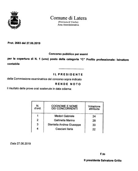Concorso pubblico per esami per la copertura di 1 posto a tempo parziale Cat. C1: Risultato delle prove orali
