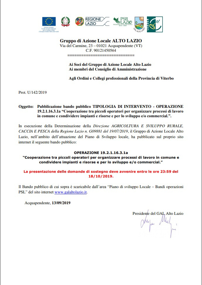 GAL Alto Lazio - Pubblicazione bando pubblico TIPOLOGIA DI INTERVENTO - OPERAZIONE 19.2.1.16.3.1a "Cooperazione tra piccoli operatori per organizzare processi di lavoro in comune e condividere impianti e risorse e per lo sviluppo e/o commercial."