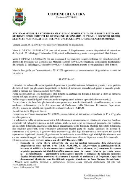 Avviso ai fini della fornitura gratuita o semigratuita dei libri di testo agli studenti degli istituti di istruzione secondaria di primo e secondo grado, statali e paritari, ai sensi dell'art. 27 legge 448/98 - Anno scolastico 2019/2020