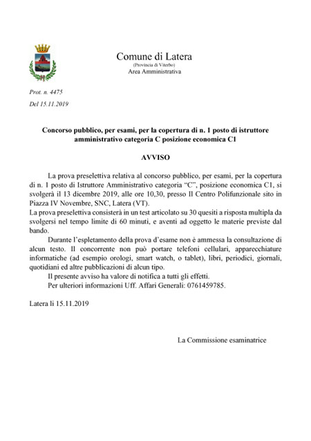 Avviso - Concorso pubblico, per esami, per la copertura di n. 1 posto di istruttore amministrativo categoria C posizione economica C1