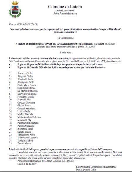 Concorso pubblico, per esami, per la copertura di n. 1 posto di istruttore Amministrativo Categoria Giuridica C, posizione economica C1 - Elenco dei candidati ammessi, a seguito della prova preselettiva svoltasi il giorno 13.12.2019, a sostenere le due prove scritte