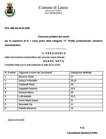 Concorso pubblico per esami per la copertura di N. 1 posto della categoria C Profilo professionale: Istruttore amministrativo. Risultato prove orali