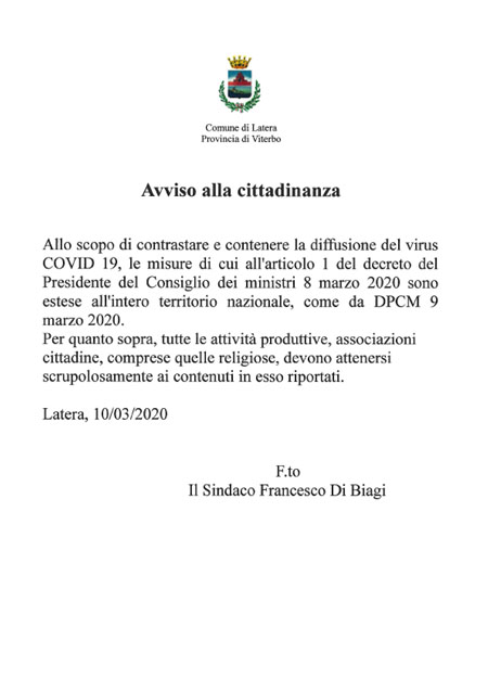 Emergenza epidemiologica COVID-19 - Avviso alla cittadinanza: con il DPCM 9 marzo 2020 le misure di cui all'articolo 1 del DPCM 8 marzo 2020 vengono estese a tutta Italia
