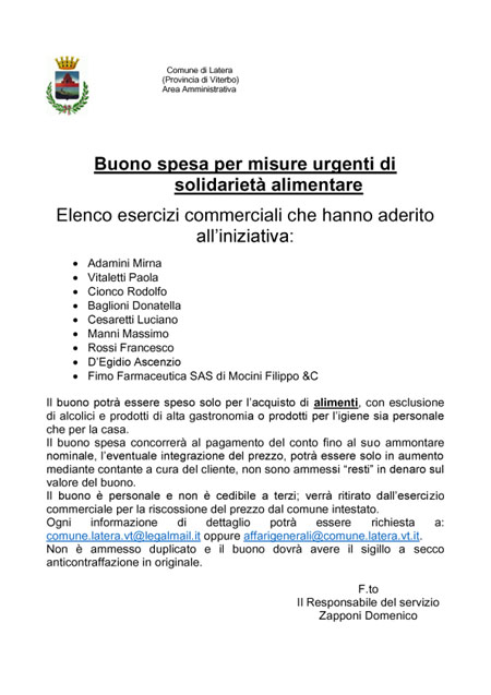 Emergenza epidemiologica COVID-19: Buono spesa per misure urgenti di solidarietà alimentare - Elenco esercizi commerciali che hanno aderito all'iniziativa
