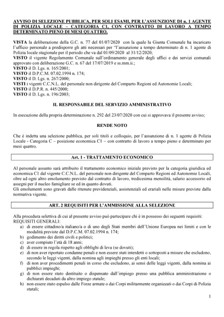 Avviso di selezione pubblica, per soli esami, per l'assunzione di n. 1 agente di polizia locale - categoria C1, con contratto di lavoro a tempo determinato pieno di mesi quattro