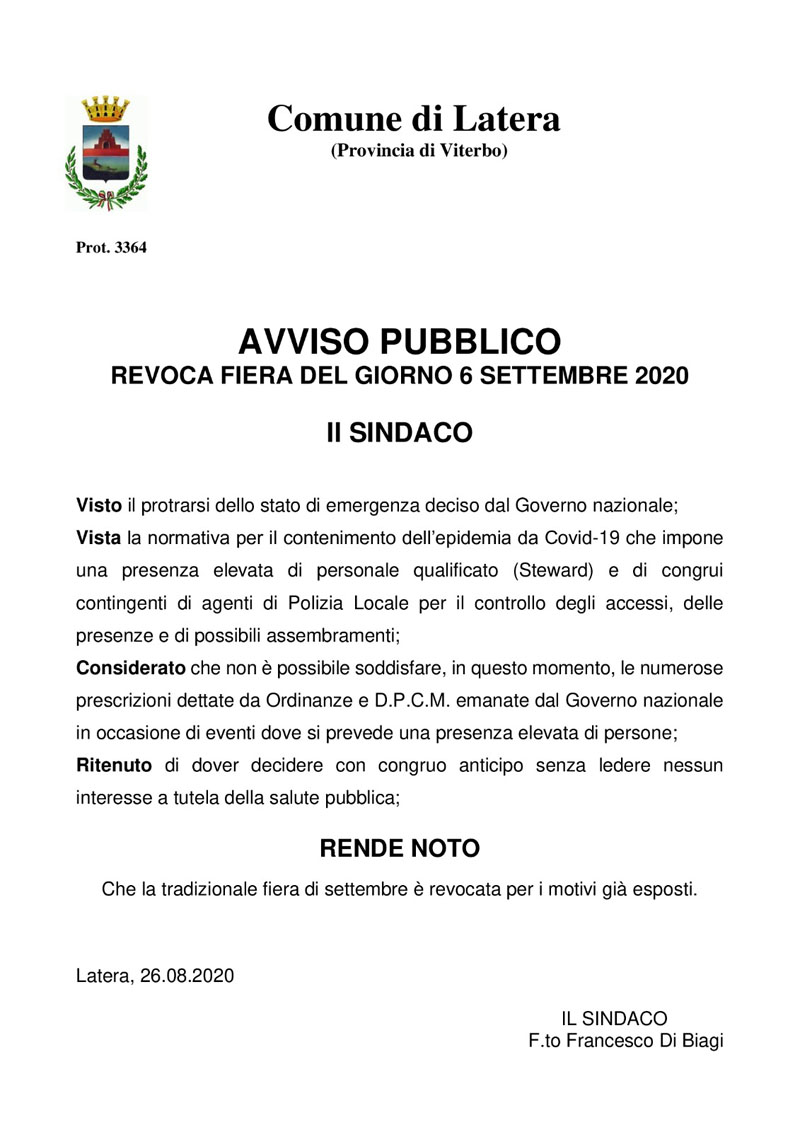 Avviso pubblico - Revoca fiera del giorno 6 settembre 2020