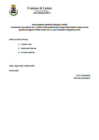 Prova pubblica selettiva (colloquio e titoli) concernente l'assunzione di n. 1 (UNO) unità di personale a tempo determinato e pieno con la qualifica di Agente Polizia Locale Cat. C1, per la durata di 4 (QUATTRO) mesi - Graduatoria finale