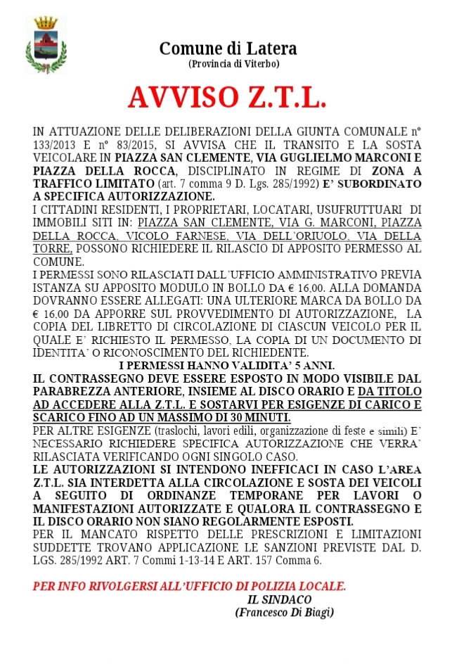 In attuazione della deliberazione della giunta comunale n. 133/2013 e n. 83/2015, si avvisa che il transito e la sosta veicolare in Piazza San Clemente, Via Guglielmo Marconi e Piazza della Rocca, disciplinato in regime di Zona a Traffico Limitato (art. 7 comma 9 D. Lgs. 285/1992) è subordinato a specifica autorizzazione Continua a leggere (Jpg - 358 Kb)