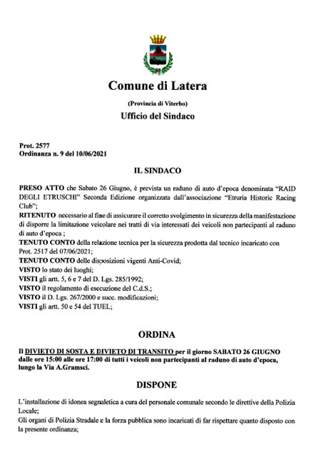 Ordinanza n.9 del 10.06.2021: Divieto di sosta e divieto di transito sabato 26 giugno 2021 dalle ore 15:00 alle ore 17:00