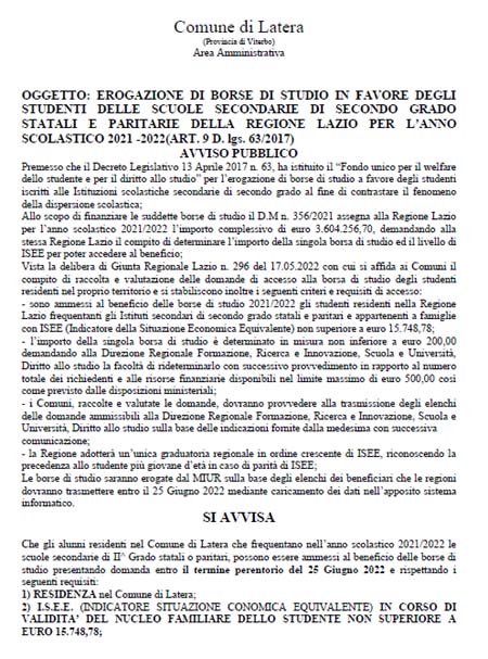 EROGAZIONE DI BORSE DI STUDIO IN FAVORE DEGLI STUDENTI DELLE SCUOLE SECONDARIE DI SECONDO GRADO STATALI E PARITARIE DELLA REGIONE LAZIO PER L’ANNO SCOLASTICO 2021 -2022