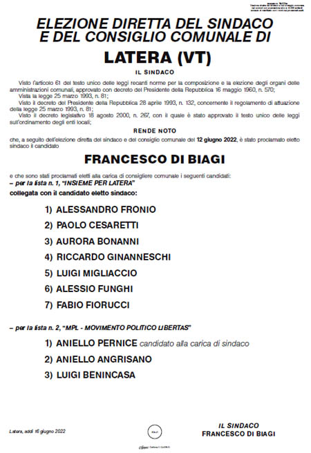 Elezione diretta del Sindaco e del Consiglio Comunale di Latera. Proclamazione degli eletti