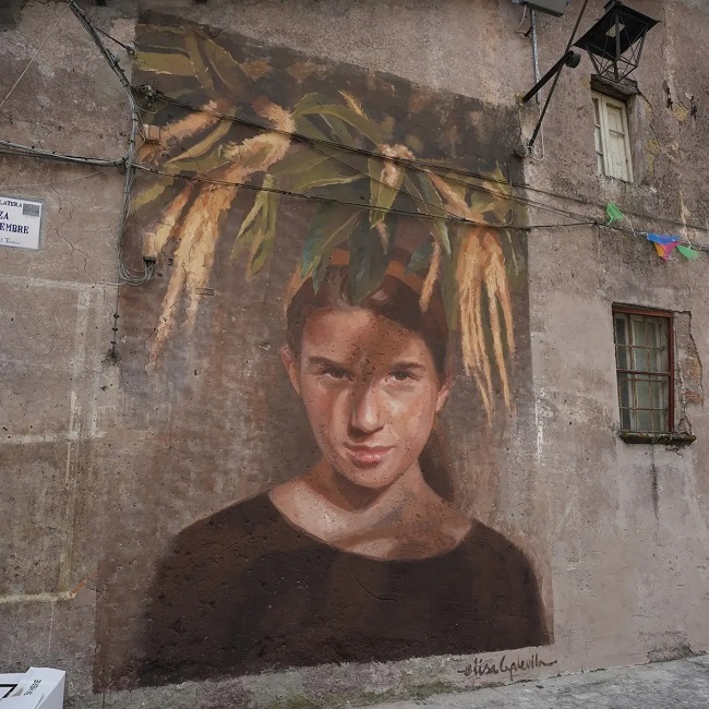 Nel murales, accanto al fiore, spicca il volto di una bambina del paese - un ritratto dolce e potente che rappresenta il futuro, la soeranza, la nuova energia.